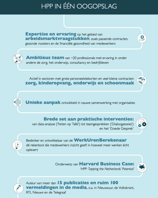 Het Potentieel Pakken (HPP) helpt organisaties in zorg, kinderopvang, onderwijs en schoonmaak om uitdagingen zoals de personeelstekorten structureel aan te pakken. Niet met één oplossing, maar door werk, roosters, inzet en inkomen in samenhang te bekijken.